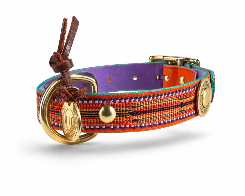 Dieses handgefertigte Hundehalsband von Lowlands Couture verbindet edles Leder in kräftigem Orange mit einem kunstvoll gewebten orientalischen Band. Die Messingdetails verleihen dem Design einen authentischen, warmen Look – wie ein Fundstück aus einem fernen Basar.