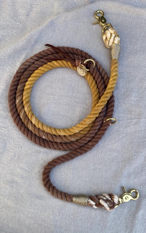 Diese braun-kamelfarbene Hundeleine wird in unserem Atelier in Bergen, NH, Niederlande, handgefertigt und gefärbt. Unsere Leinen werden von Hand gespleißt, um Zugkräften von mehreren hundert Kilogramm standzuhalten. Die Enden werden anschließend für zusätzliche Haltbarkeit „gespleißt und verstärkt“ (ein alter nautischer Begriff). An den Enden befinden sich unsere Karabiner aus massivem Messing mit drehbarem Öse. Diese sorgen für zusätzliche Sicherheit für große und kleine Hunde.